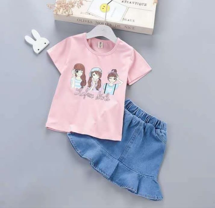 Bottom: Stylish high-waisted denim skirt with a ruffled hem and elastic waistband for easy wear and playful twirls. - Available Sizes: 1 to 3 years