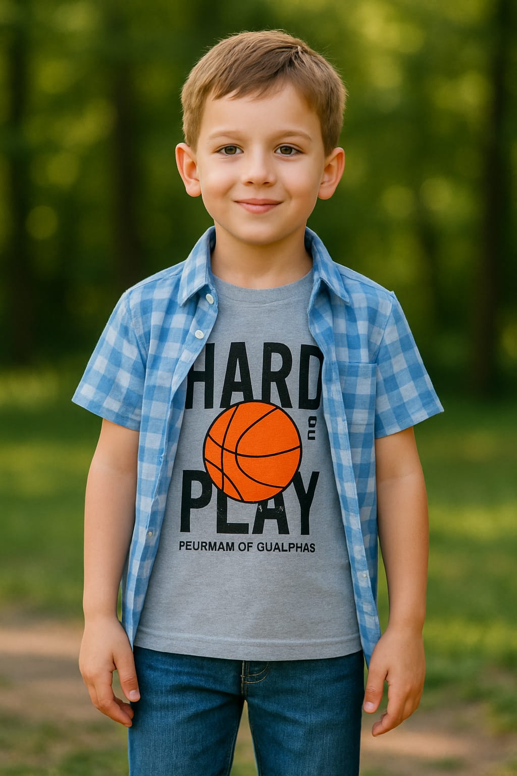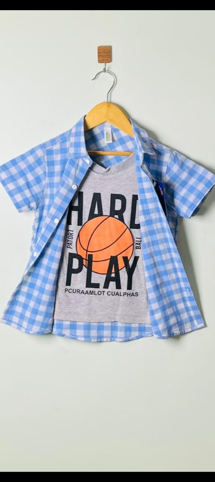 Give your little champ a trendy layered look with this stylish double shirt set! The outfit features a soft, grey printed T-shirt with a vibrant basketball graphic and bold “HARD PLAY” lettering, paired with a lightweight, short-sleeved blue-and-white checkered shirt. Perfect for casual outings, park playdates, or stylish school days.