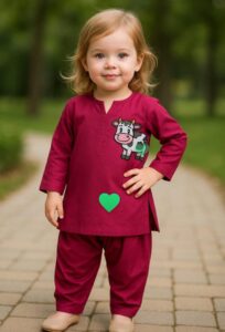Brighten up your little one’s wardrobe with this adorable maroon shalwar kameez set, perfect for girls aged 1 to 8 years. Crafted from soft, breathable lawn fabric, this outfit ensures all-day comfort while adding a fun twist with a cute cow cartoon print on the front.