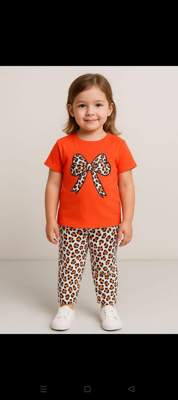 Add a pop of fun and fashion to your child’s wardrobe with the Wild Chic Bow Set. This vibrant orange tee features a bold leopard-print bow graphic that matches perfectly with the printed jogger-style pants for a coordinated, trendy look.